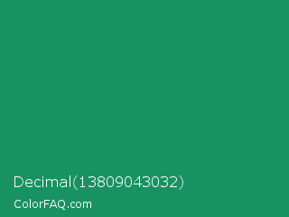 Decimal 13809043032 Color is a normal green color and the nearest color is Eucalyptus #278a5b. Hex code #189262 and RGB value is rgb(24,146,98). In RGB color space, this color is composed of 9% red, 57% green, 38% blue, In CMYK color space, this color is composed of 84% cyan, 0% magenta, 33% yellow , 43% black , In HSL color space, this color has a hue angle of 156° , 72% saturation and 33% lightness.