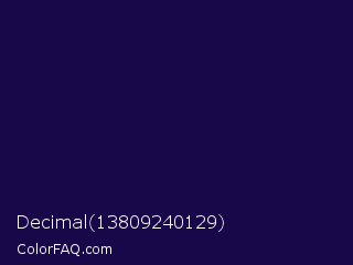 Decimal 13809240129 Color is a very dark indigo color and the nearest color is Tolopea #1b0245. Hex code #190849 and RGB value is rgb(25,8,73). In RGB color space, this color is composed of 10% red, 3% green, 29% blue, In CMYK color space, this color is composed of 66% cyan, 89% magenta, 0% yellow , 71% black , In HSL color space, this color has a hue angle of 256° , 80% saturation and 16% lightness.