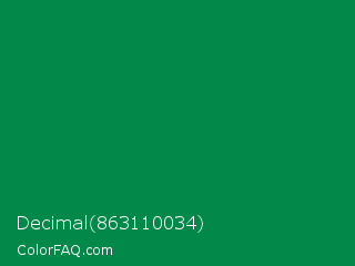 Decimal 863110034 Color is a dark green color and the nearest color is Salem #097f4b. Hex code #028848 and RGB value is rgb(2,136,72). In RGB color space, this color is composed of 1% red, 53% green, 28% blue, In CMYK color space, this color is composed of 99% cyan, 0% magenta, 47% yellow , 47% black , In HSL color space, this color has a hue angle of 151° , 97% saturation and 27% lightness.