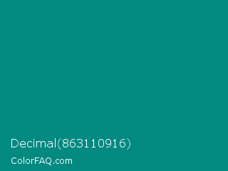 Decimal 863110916 Color is a dark cyan color and the nearest color is Teal Green #00827f. Hex code #028980 and RGB value is rgb(2,137,128). In RGB color space, this color is composed of 1% red, 54% green, 50% blue, In CMYK color space, this color is composed of 99% cyan, 0% magenta, 7% yellow , 46% black , In HSL color space, this color has a hue angle of 176° , 97% saturation and 27% lightness.