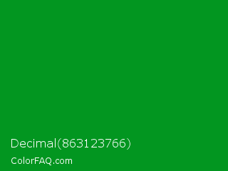 Decimal 863123766 Color is a dark green color and the nearest color is North Texas Green #059033. Hex code #029620 and RGB value is rgb(2,150,32). In RGB color space, this color is composed of 1% red, 59% green, 13% blue, In CMYK color space, this color is composed of 99% cyan, 0% magenta, 79% yellow , 41% black , In HSL color space, this color has a hue angle of 132° , 97% saturation and 30% lightness.