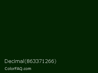 Decimal 863371266 Color is a almost black green color and the nearest color is Deep Fir #002900. Hex code #032302 and RGB value is rgb(3,35,2). In RGB color space, this color is composed of 1% red, 14% green, 1% blue, In CMYK color space, this color is composed of 91% cyan, 0% magenta, 94% yellow , 86% black , In HSL color space, this color has a hue angle of 118° , 89% saturation and 7% lightness.