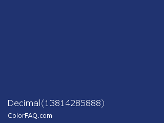 Decimal 13814285888 Color is a dark blue color and the nearest color is Astronaut #283a77. Hex code #203370 and RGB value is rgb(32,51,112). In RGB color space, this color is composed of 13% red, 20% green, 44% blue, In CMYK color space, this color is composed of 71% cyan, 54% magenta, 0% yellow , 56% black , In HSL color space, this color has a hue angle of 226° , 56% saturation and 28% lightness.