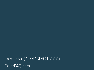Decimal 13814301777 Color is a dark blue color and the nearest color is Blue Dianne #204852. Hex code #204253 and RGB value is rgb(32,66,83). In RGB color space, this color is composed of 13% red, 26% green, 33% blue, In CMYK color space, this color is composed of 61% cyan, 20% magenta, 0% yellow , 67% black , In HSL color space, this color has a hue angle of 200° , 44% saturation and 23% lightness.