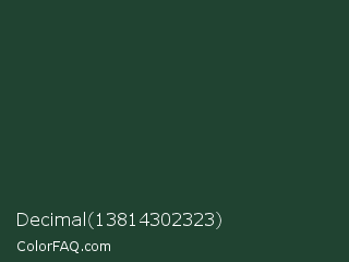 Decimal 13814302323 Color is a very dark green color and the nearest color is Everglade #1c402e. Hex code #204331 and RGB value is rgb(32,67,49). In RGB color space, this color is composed of 13% red, 26% green, 19% blue, In CMYK color space, this color is composed of 52% cyan, 0% magenta, 27% yellow , 74% black , In HSL color space, this color has a hue angle of 149° , 35% saturation and 19% lightness.