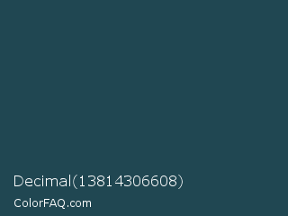Decimal 13814306608 Color is a very dark cyan color and the nearest color is Blue Dianne #204852. Hex code #204752 and RGB value is rgb(32,71,82). In RGB color space, this color is composed of 13% red, 28% green, 32% blue, In CMYK color space, this color is composed of 61% cyan, 13% magenta, 0% yellow , 68% black , In HSL color space, this color has a hue angle of 193° , 44% saturation and 22% lightness.