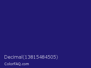 Decimal 13815484505 Color is a dark indigo color and the nearest color is Midnight Blue #191970. Hex code #221973 and RGB value is rgb(34,25,115). In RGB color space, this color is composed of 13% red, 10% green, 45% blue, In CMYK color space, this color is composed of 70% cyan, 78% magenta, 0% yellow , 55% black , In HSL color space, this color has a hue angle of 246° , 64% saturation and 27% lightness.