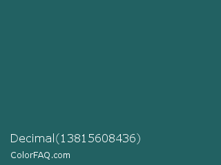 Decimal 13815608436 Color is a dark cyan color and the nearest color is Casal #2f6168. Hex code #226162 and RGB value is rgb(34,97,98). In RGB color space, this color is composed of 13% red, 38% green, 38% blue, In CMYK color space, this color is composed of 65% cyan, 1% magenta, 0% yellow , 62% black , In HSL color space, this color has a hue angle of 181° , 48% saturation and 26% lightness.