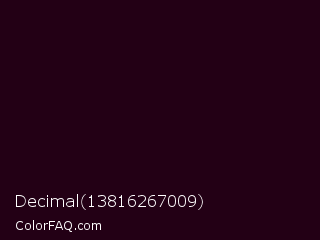 Decimal 13816267009 Color is a almost black magenta color and the nearest color is Night Rider #1f120f. Hex code #230015 and RGB value is rgb(35,0,21). In RGB color space, this color is composed of 14% red, 0% green, 8% blue, In CMYK color space, this color is composed of 0% cyan, 100% magenta, 40% yellow , 86% black , In HSL color space, this color has a hue angle of 324° , 100% saturation and 7% lightness.