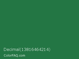 Decimal 13816464214 Color is a dark green color and the nearest color is Dark Spring Green #177245. Hex code #237644 and RGB value is rgb(35,118,68). In RGB color space, this color is composed of 14% red, 46% green, 27% blue, In CMYK color space, this color is composed of 70% cyan, 0% magenta, 42% yellow , 54% black , In HSL color space, this color has a hue angle of 144° , 54% saturation and 30% lightness.