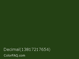 Decimal 13817217654 Color is a very dark green color and the nearest color is Mallard #233418. Hex code #244114 and RGB value is rgb(36,65,20). In RGB color space, this color is composed of 14% red, 25% green, 8% blue, In CMYK color space, this color is composed of 45% cyan, 0% magenta, 69% yellow , 75% black , In HSL color space, this color has a hue angle of 99° , 53% saturation and 17% lightness.
