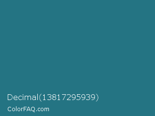 Decimal 13817295939 Color is a normal cyan color and the nearest color is Elm #1c7c7d. Hex code #247483 and RGB value is rgb(36,116,131). In RGB color space, this color is composed of 14% red, 45% green, 51% blue, In CMYK color space, this color is composed of 73% cyan, 11% magenta, 0% yellow , 49% black , In HSL color space, this color has a hue angle of 189° , 57% saturation and 33% lightness.