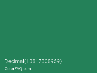 Decimal 13817308969 Color is a normal green color and the nearest color is Eucalyptus #278a5b. Hex code #248159 and RGB value is rgb(36,129,89). In RGB color space, this color is composed of 14% red, 51% green, 35% blue, In CMYK color space, this color is composed of 72% cyan, 0% magenta, 31% yellow , 49% black , In HSL color space, this color has a hue angle of 154° , 56% saturation and 32% lightness.