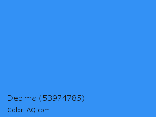 Decimal 53974785 Color is a normal blue color and the nearest color is Brilliant Azure #3399ff. Hex code #3391f5 and RGB value is rgb(51,145,245). In RGB color space, this color is composed of 20% red, 57% green, 96% blue, In CMYK color space, this color is composed of 79% cyan, 41% magenta, 0% yellow , 4% black , In HSL color space, this color has a hue angle of 211° , 91% saturation and 58% lightness.