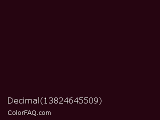 Decimal 13824645509 Color is a almost black rose color and the nearest color is Night Rider #1f120f. Hex code #260511 and RGB value is rgb(38,5,17). In RGB color space, this color is composed of 15% red, 2% green, 7% blue, In CMYK color space, this color is composed of 0% cyan, 87% magenta, 55% yellow , 85% black , In HSL color space, this color has a hue angle of 338° , 77% saturation and 8% lightness.