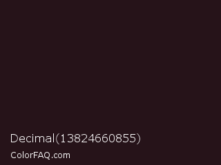 Decimal 13824660855 Color is a very dark rose color and the nearest color is Gondola #261414. Hex code #261319 and RGB value is rgb(38,19,25). In RGB color space, this color is composed of 15% red, 7% green, 10% blue, In CMYK color space, this color is composed of 0% cyan, 50% magenta, 34% yellow , 85% black , In HSL color space, this color has a hue angle of 341° , 33% saturation and 11% lightness.