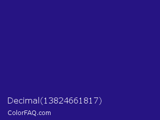 Decimal 13824661817 Color is a dark indigo color and the nearest color is Blue Gem #2c0e8c. Hex code #261483 and RGB value is rgb(38,20,131). In RGB color space, this color is composed of 15% red, 8% green, 51% blue, In CMYK color space, this color is composed of 71% cyan, 85% magenta, 0% yellow , 49% black , In HSL color space, this color has a hue angle of 250° , 74% saturation and 30% lightness.