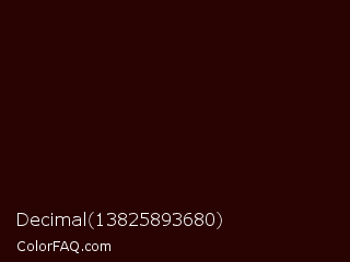 Decimal 13825893680 Color is a almost black red color and the nearest color is Sepia Black #2b0202. Hex code #280302 and RGB value is rgb(40,3,2). In RGB color space, this color is composed of 16% red, 1% green, 1% blue, In CMYK color space, this color is composed of 0% cyan, 93% magenta, 95% yellow , 84% black , In HSL color space, this color has a hue angle of 2° , 90% saturation and 8% lightness.
