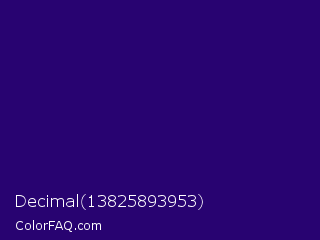 Decimal 13825893953 Color is a dark indigo color and the nearest color is Paris M #26056a. Hex code #280371 and RGB value is rgb(40,3,113). In RGB color space, this color is composed of 16% red, 1% green, 44% blue, In CMYK color space, this color is composed of 65% cyan, 97% magenta, 0% yellow , 56% black , In HSL color space, this color has a hue angle of 260° , 95% saturation and 23% lightness.