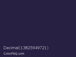 Decimal 13825949721 Color is a very dark indigo color and the nearest color is Ebony Clay #26283b. Hex code #282043 and RGB value is rgb(40,32,67). In RGB color space, this color is composed of 16% red, 13% green, 26% blue, In CMYK color space, this color is composed of 40% cyan, 52% magenta, 0% yellow , 74% black , In HSL color space, this color has a hue angle of 254° , 35% saturation and 19% lightness.