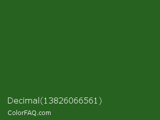 Decimal 13826066561 Color is a dark green color and the nearest color is Mughal Green #306030. Hex code #286221 and RGB value is rgb(40,98,33). In RGB color space, this color is composed of 16% red, 38% green, 13% blue, In CMYK color space, this color is composed of 59% cyan, 0% magenta, 66% yellow , 62% black , In HSL color space, this color has a hue angle of 114° , 50% saturation and 26% lightness.