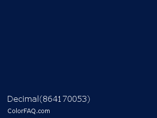 Decimal 864170053 Color is a very dark blue color and the nearest color is Oxford Blue #002147. Hex code #041945 and RGB value is rgb(4,25,69). In RGB color space, this color is composed of 2% red, 10% green, 27% blue, In CMYK color space, this color is composed of 94% cyan, 64% magenta, 0% yellow , 73% black , In HSL color space, this color has a hue angle of 221° , 89% saturation and 14% lightness.