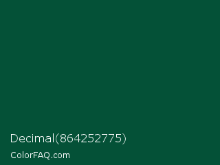 Decimal 864252775 Color is a very dark green color and the nearest color is Sacramento State Green #00563f. Hex code #045137 and RGB value is rgb(4,81,55). In RGB color space, this color is composed of 2% red, 32% green, 22% blue, In CMYK color space, this color is composed of 95% cyan, 0% magenta, 32% yellow , 68% black , In HSL color space, this color has a hue angle of 160° , 91% saturation and 17% lightness.