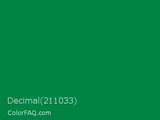 Decimal 211033 Color is a dark green color and the nearest color is Salem #097f4b. Hex code #008443 and RGB value is rgb(0,132,67). In RGB color space, this color is composed of 0% red, 52% green, 26% blue, In CMYK color space, this color is composed of 100% cyan, 0% magenta, 49% yellow , 48% black , In HSL color space, this color has a hue angle of 150° , 100% saturation and 26% lightness.