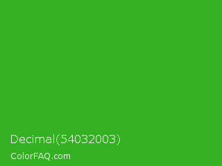 Decimal 54032003 Color is a normal green color and the nearest color is Wageningen Green #34b233. Hex code #33b123 and RGB value is rgb(51,177,35). In RGB color space, this color is composed of 20% red, 69% green, 14% blue, In CMYK color space, this color is composed of 71% cyan, 0% magenta, 80% yellow , 31% black , In HSL color space, this color has a hue angle of 113° , 67% saturation and 42% lightness.