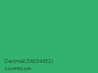 Decimal 54034452 Color is a normal green color and the nearest color is Medium Sea Green #3cb371. Hex code #33b26e and RGB value is rgb(51,178,110). In RGB color space, this color is composed of 20% red, 70% green, 43% blue, In CMYK color space, this color is composed of 71% cyan, 0% magenta, 38% yellow , 30% black , In HSL color space, this color has a hue angle of 148° , 55% saturation and 45% lightness.
