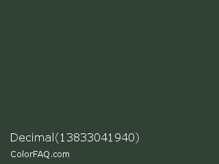 Decimal 13833041940 Color is a dark green color and the nearest color is Kombu Green #354230. Hex code #324136 and RGB value is rgb(50,65,54). In RGB color space, this color is composed of 20% red, 25% green, 21% blue, In CMYK color space, this color is composed of 23% cyan, 0% magenta, 17% yellow , 75% black , In HSL color space, this color has a hue angle of 136° , 13% saturation and 23% lightness.