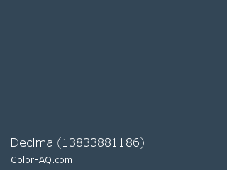Decimal 13833881186 Color is a dark blue color and the nearest color is Pickled Bluewood #314459. Hex code #334656 and RGB value is rgb(51,70,86). In RGB color space, this color is composed of 20% red, 27% green, 34% blue, In CMYK color space, this color is composed of 41% cyan, 19% magenta, 0% yellow , 66% black , In HSL color space, this color has a hue angle of 207° , 26% saturation and 27% lightness.