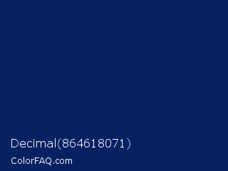 Decimal 864618071 Color is a very dark blue color and the nearest color is Madison #09255d. Hex code #052161 and RGB value is rgb(5,33,97). In RGB color space, this color is composed of 2% red, 13% green, 38% blue, In CMYK color space, this color is composed of 95% cyan, 66% magenta, 0% yellow , 62% black , In HSL color space, this color has a hue angle of 222° , 90% saturation and 20% lightness.