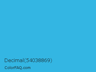 Decimal 54038869 Color is a normal blue color and the nearest color is Scooter #2ebfd4. Hex code #33b6e3 and RGB value is rgb(51,182,227). In RGB color space, this color is composed of 20% red, 71% green, 89% blue, In CMYK color space, this color is composed of 78% cyan, 20% magenta, 0% yellow , 11% black , In HSL color space, this color has a hue angle of 195° , 76% saturation and 55% lightness.