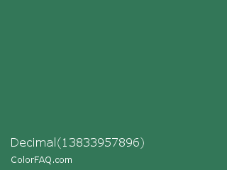 Decimal 13833957896 Color is a normal green color and the nearest color is Amazon #3b7a57. Hex code #337758 and RGB value is rgb(51,119,88). In RGB color space, this color is composed of 20% red, 47% green, 35% blue, In CMYK color space, this color is composed of 57% cyan, 0% magenta, 26% yellow , 53% black , In HSL color space, this color has a hue angle of 153° , 40% saturation and 33% lightness.