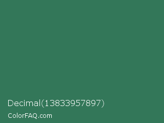 Decimal 13833957897 Color is a normal green color and the nearest color is Amazon #3b7a57. Hex code #337759 and RGB value is rgb(51,119,89). In RGB color space, this color is composed of 20% red, 47% green, 35% blue, In CMYK color space, this color is composed of 57% cyan, 0% magenta, 25% yellow , 53% black , In HSL color space, this color has a hue angle of 154° , 40% saturation and 33% lightness.