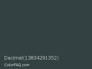 Decimal 13834291352 Color is a dark cyan color and the nearest color is Cape Cod #3c4443. Hex code #344142 and RGB value is rgb(52,65,66). In RGB color space, this color is composed of 20% red, 25% green, 26% blue, In CMYK color space, this color is composed of 21% cyan, 2% magenta, 0% yellow , 74% black , In HSL color space, this color has a hue angle of 184° , 12% saturation and 23% lightness.