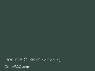 Decimal 13834324293 Color is a dark green color and the nearest color is Cape Cod #3c4443. Hex code #344941 and RGB value is rgb(52,73,65). In RGB color space, this color is composed of 20% red, 29% green, 25% blue, In CMYK color space, this color is composed of 29% cyan, 0% magenta, 11% yellow , 71% black , In HSL color space, this color has a hue angle of 157° , 17% saturation and 25% lightness.