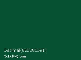 Decimal 865085591 Color is a very dark green color and the nearest color is Sacramento State Green #00563f. Hex code #055131 and RGB value is rgb(5,81,49). In RGB color space, this color is composed of 2% red, 32% green, 19% blue, In CMYK color space, this color is composed of 94% cyan, 0% magenta, 40% yellow , 68% black , In HSL color space, this color has a hue angle of 155° , 88% saturation and 17% lightness.