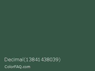 Decimal 13841438039 Color is a dark green color and the nearest color is Dark Slate Gray #2f4f4f. Hex code #355545 and RGB value is rgb(53,85,69). In RGB color space, this color is composed of 21% red, 33% green, 27% blue, In CMYK color space, this color is composed of 38% cyan, 0% magenta, 19% yellow , 67% black , In HSL color space, this color has a hue angle of 150° , 23% saturation and 27% lightness.