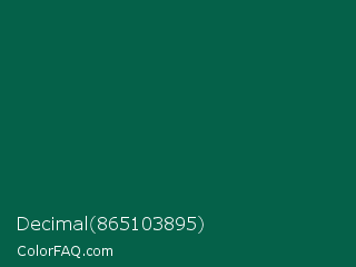 Decimal 865103895 Color is a very dark cyan color and the nearest color is Bottle Green #006a4e. Hex code #056149 and RGB value is rgb(5,97,73). In RGB color space, this color is composed of 2% red, 38% green, 29% blue, In CMYK color space, this color is composed of 95% cyan, 0% magenta, 25% yellow , 62% black , In HSL color space, this color has a hue angle of 164° , 90% saturation and 20% lightness.