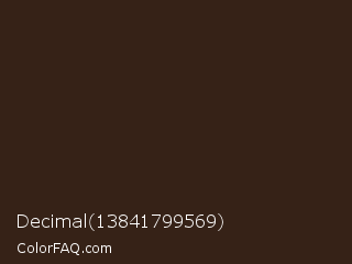 Decimal 13841799569 Color is a very dark orange color and the nearest color is Eclipse #311c17. Hex code #362217 and RGB value is rgb(54,34,23). In RGB color space, this color is composed of 21% red, 13% green, 9% blue, In CMYK color space, this color is composed of 0% cyan, 37% magenta, 57% yellow , 79% black , In HSL color space, this color has a hue angle of 21° , 40% saturation and 15% lightness.