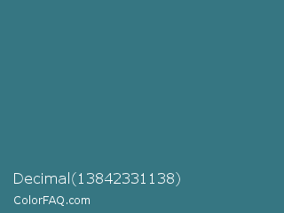 Decimal 13842331138 Color is a normal cyan color and the nearest color is Ming #36747d. Hex code #367682 and RGB value is rgb(54,118,130). In RGB color space, this color is composed of 21% red, 46% green, 51% blue, In CMYK color space, this color is composed of 58% cyan, 9% magenta, 0% yellow , 49% black , In HSL color space, this color has a hue angle of 189° , 41% saturation and 36% lightness.