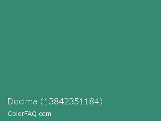 Decimal 13842351184 Color is a normal green color and the nearest color is Illuminating Emerald #319177. Hex code #368972 and RGB value is rgb(54,137,114). In RGB color space, this color is composed of 21% red, 54% green, 45% blue, In CMYK color space, this color is composed of 61% cyan, 0% magenta, 17% yellow , 46% black , In HSL color space, this color has a hue angle of 163° , 43% saturation and 37% lightness.
