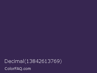 Decimal 13842613769 Color is a dark violet color and the nearest color is Martinique #363050. Hex code #372651 and RGB value is rgb(55,38,81). In RGB color space, this color is composed of 22% red, 15% green, 32% blue, In CMYK color space, this color is composed of 32% cyan, 53% magenta, 0% yellow , 68% black , In HSL color space, this color has a hue angle of 264° , 36% saturation and 23% lightness.