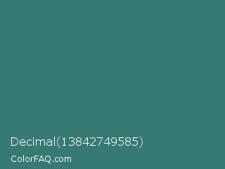 Decimal 13842749585 Color is a normal cyan color and the nearest color is Oracle #377475. Hex code #377973 and RGB value is rgb(55,121,115). In RGB color space, this color is composed of 22% red, 47% green, 45% blue, In CMYK color space, this color is composed of 55% cyan, 0% magenta, 5% yellow , 53% black , In HSL color space, this color has a hue angle of 175° , 38% saturation and 35% lightness.