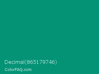 Decimal 865179746 Color is a dark cyan color and the nearest color is Paolo Veronese Green #009b7d. Hex code #059376 and RGB value is rgb(5,147,118). In RGB color space, this color is composed of 2% red, 58% green, 46% blue, In CMYK color space, this color is composed of 97% cyan, 0% magenta, 20% yellow , 42% black , In HSL color space, this color has a hue angle of 168° , 93% saturation and 30% lightness.