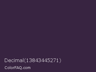 Decimal 13843445271 Color is a very dark purple color and the nearest color is Blackcurrant #32293a. Hex code #382441 and RGB value is rgb(56,36,65). In RGB color space, this color is composed of 22% red, 14% green, 25% blue, In CMYK color space, this color is composed of 14% cyan, 45% magenta, 0% yellow , 75% black , In HSL color space, this color has a hue angle of 281° , 29% saturation and 20% lightness.