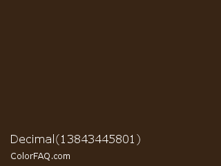 Decimal 13843445801 Color is a very dark orange color and the nearest color is Sambuca #3a2010. Hex code #382515 and RGB value is rgb(56,37,21). In RGB color space, this color is composed of 22% red, 15% green, 8% blue, In CMYK color space, this color is composed of 0% cyan, 34% magenta, 63% yellow , 78% black , In HSL color space, this color has a hue angle of 27° , 45% saturation and 15% lightness.