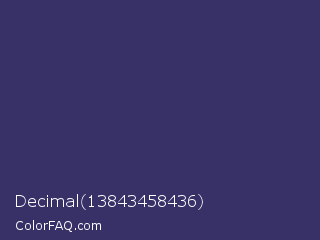 Decimal 13843458436 Color is a dark indigo color and the nearest color is Deep Koamaru #333366. Hex code #383168 and RGB value is rgb(56,49,104). In RGB color space, this color is composed of 22% red, 19% green, 41% blue, In CMYK color space, this color is composed of 46% cyan, 53% magenta, 0% yellow , 59% black , In HSL color space, this color has a hue angle of 248° , 36% saturation and 30% lightness.